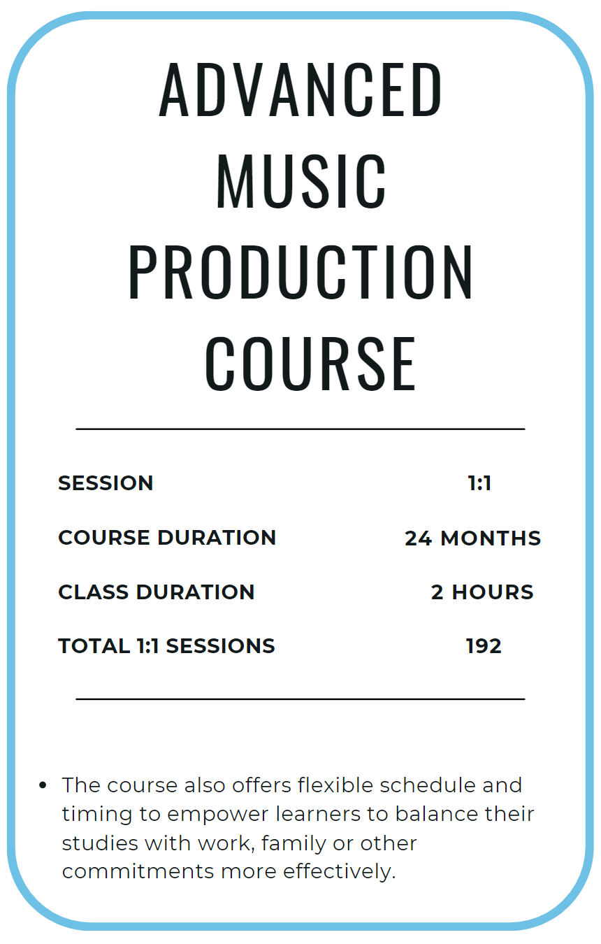 This one-on-one course is designed to provide aspiring music producers with skills, knowledge and hands-on experience needed to succeed in the music industry. Covering everything from music theory basics to advanced music production techniques, the course will take students through the entire music production process using industry standard software and tools. This course equips students with the essential skills to thrive as modern music producer.