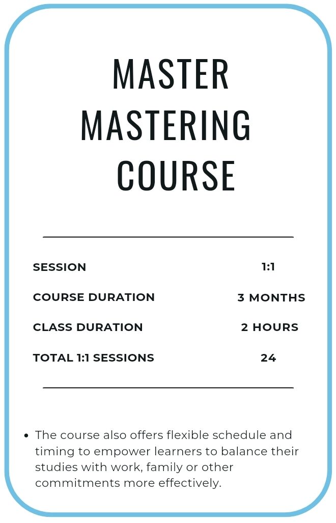 A one-on-one session provides personalised instructions and feedback as only one student is in attendance with the instructor. Sessions are conducted through video calls and using screen sharing, instructor demonstrates techniques, critiques your work and assign tasks. The loopback feature allows you to hear exactly what instructor is hearing enhancing functionality and versatility hence enabling creative possibilities and streamlining course flow.